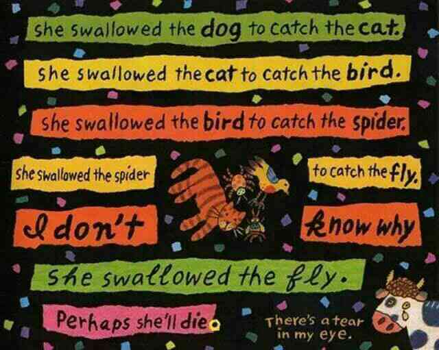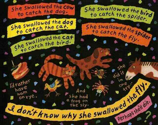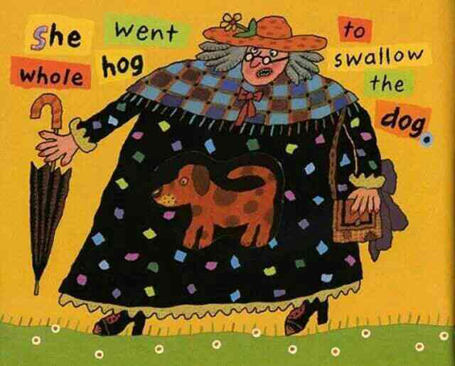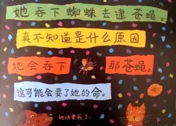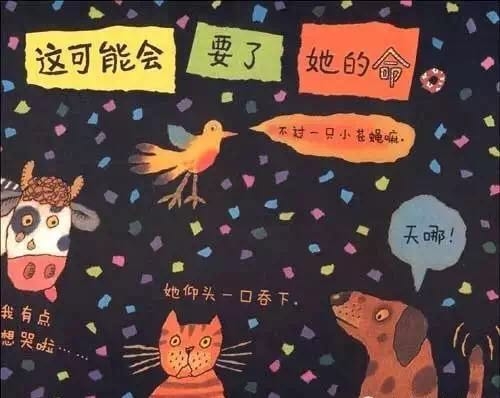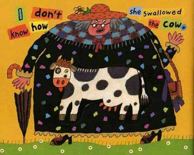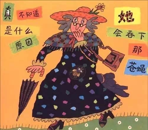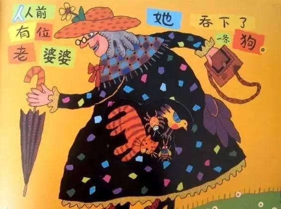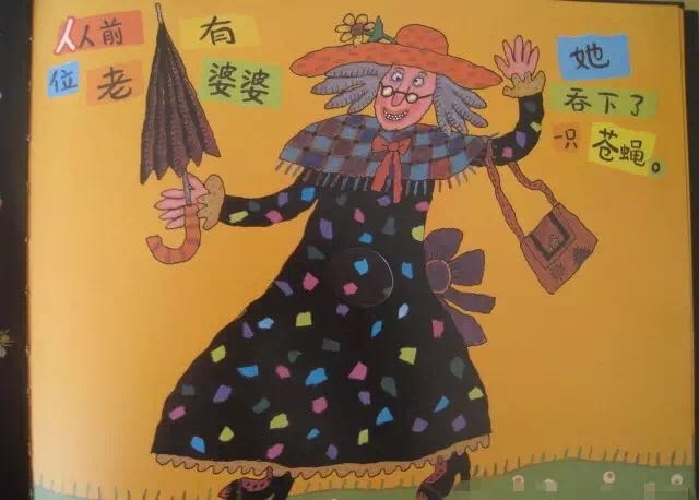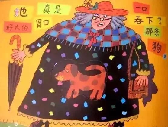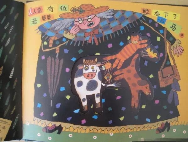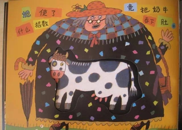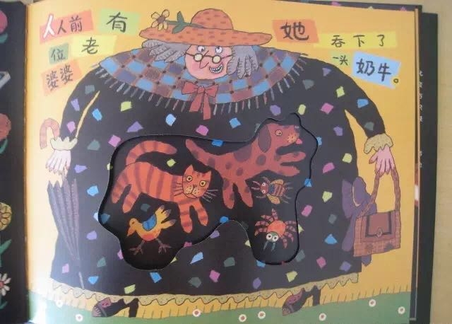 有个老婆婆吞了一只苍蝇,然后她吞下蜘蛛去逮苍蝇、吞下鸟儿去捉蜘蛛、吞下猫去抓鸟儿、吞下狗去咬猫、吞下奶牛去追狗,最后吞下一匹马——她撑死了! 这是一首人们耳熟能详的民谣,可是谁也不知老婆婆肚子里的情况是怎样的,西姆斯•塔贝克用不断变大的洞洞,展现了生动跳跃的视觉效果,新鲜有趣!他还用撕纸拼贴的方式,把日常生活中的小物件融入故事中,又添了一份独到的艺术巧思! 故事结构循环往复,语言富于韵律节奏,让孩子读起来朗朗上口;情节简单又夸张,充满了来自民间的诙谐和糅合了传统与现代的无厘头式幽默!