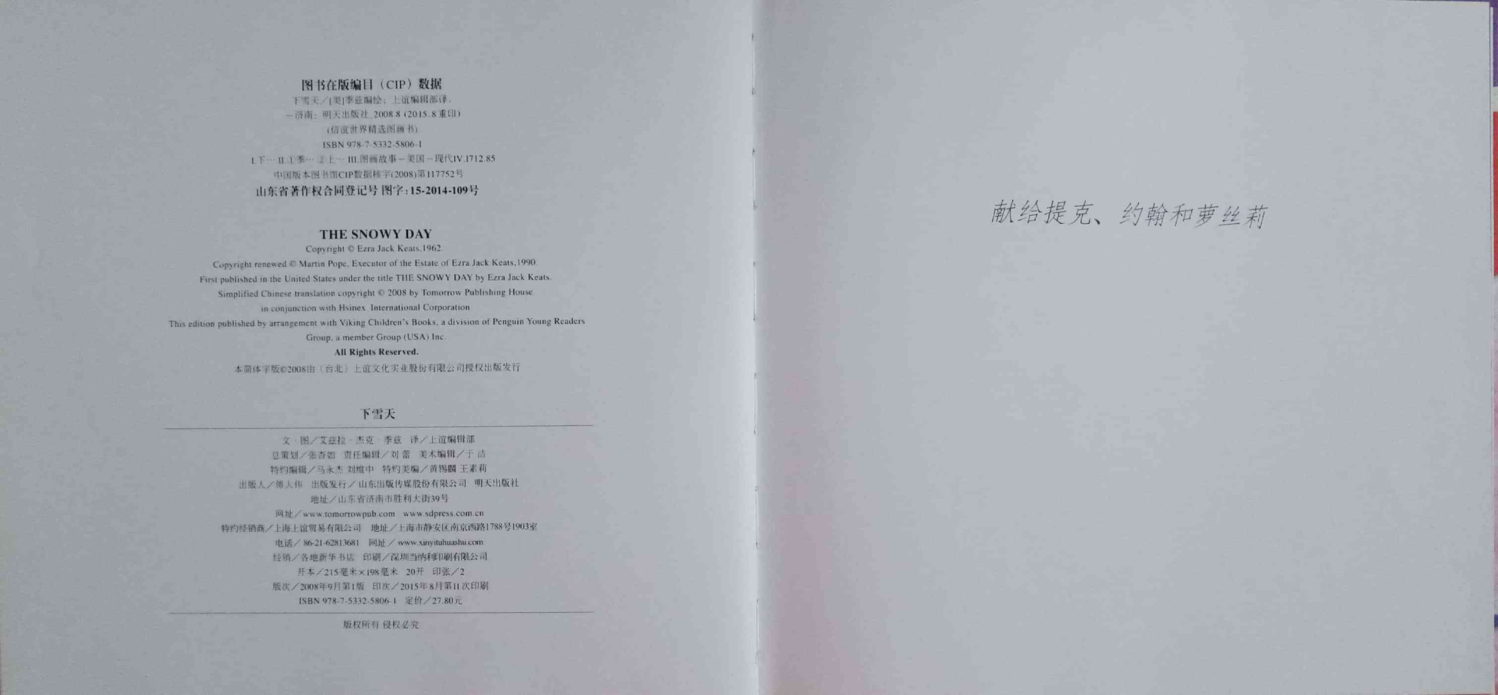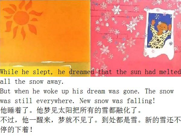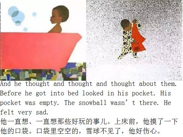 小男孩彼得,一早醒来发现昨夜下了雪,兴奋地跑到雪地里玩各种游戏,他堆了一个雪人和一个天使。回家前,还把在院子里捏的雪球放进口袋里,想留到明天再玩。回家后彼得泡在浴缸里,还忍不住一再回味,于是睡前去翻口袋,找寻带回来的雪,口袋却是空的,小雪球不见了,让他很失望。上床后又梦到太阳溶融了所有的雪。但他一觉醒来,窗外却正在下着雪…… 简单的故事却传神地展现出儿童的天真、好奇、幽默和创意。 ●1963年荣获久负盛名的凯迪克金奖。 ●纽约公共图书馆「世纪之书」Books of the Century ●纽约公共图书馆「每个人都必须知道的100本图画书」入选100 Picture Books Everyone Should Know