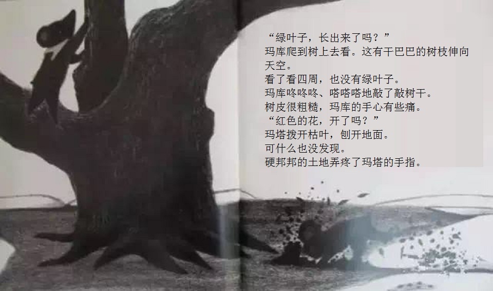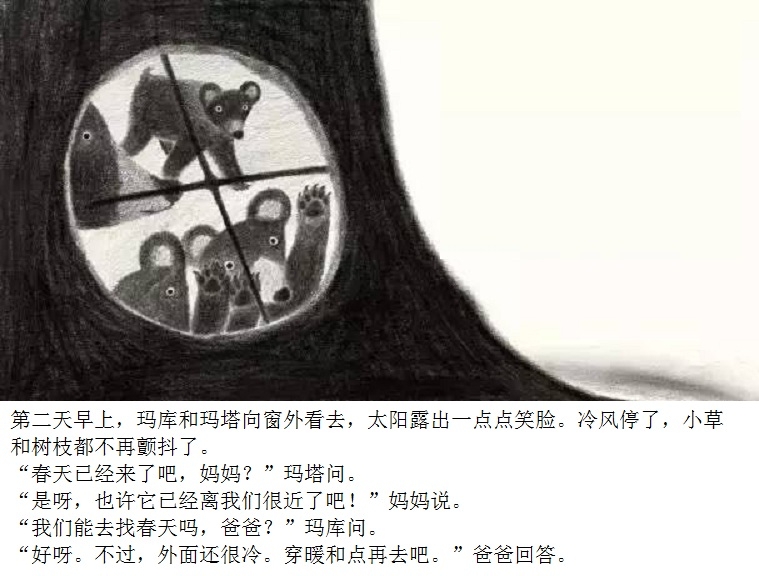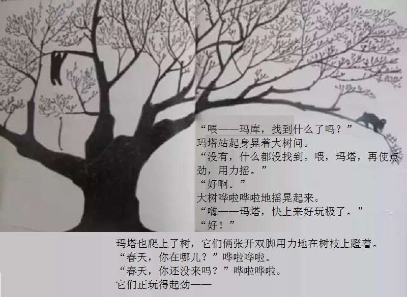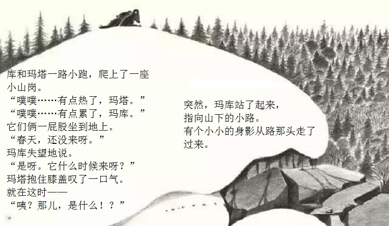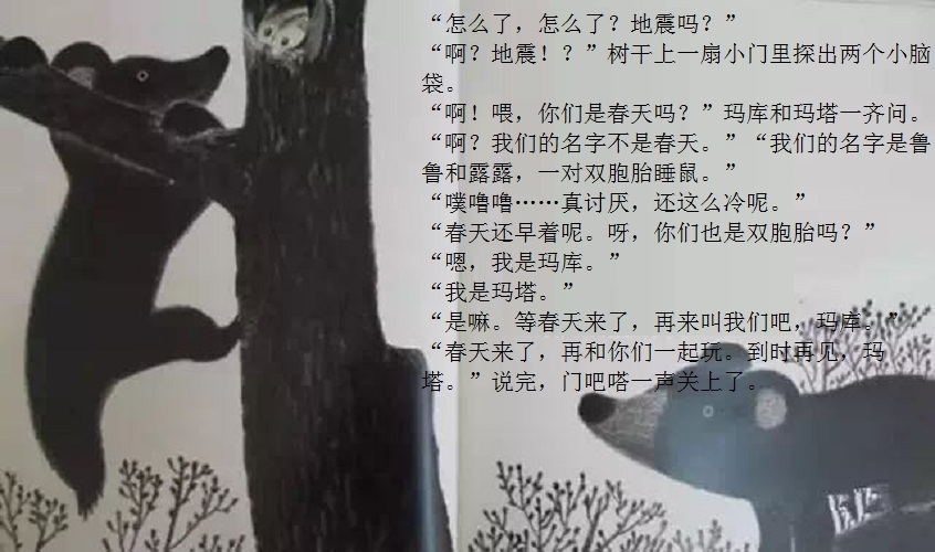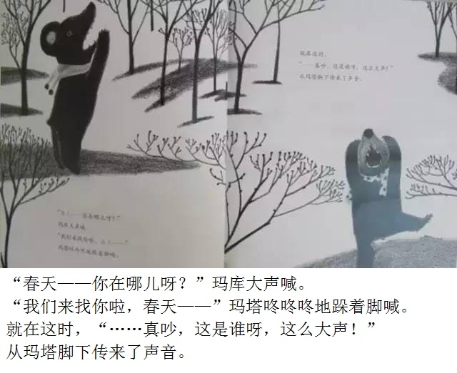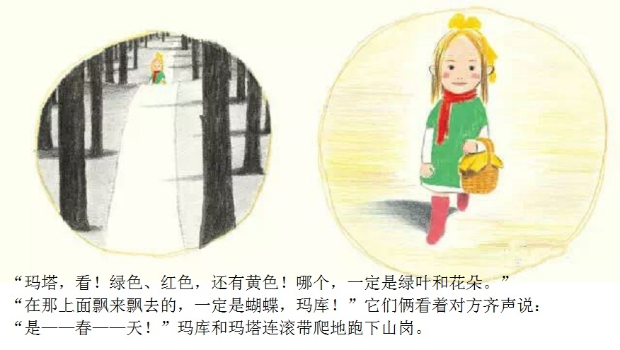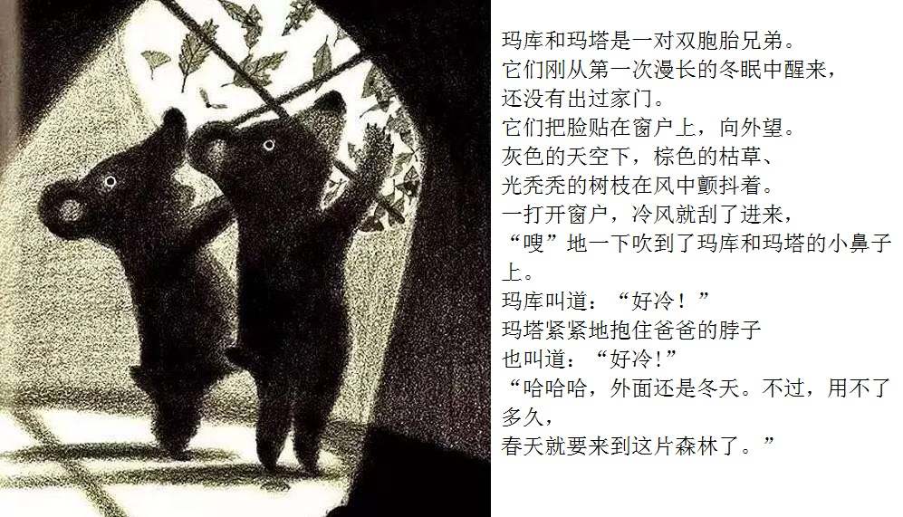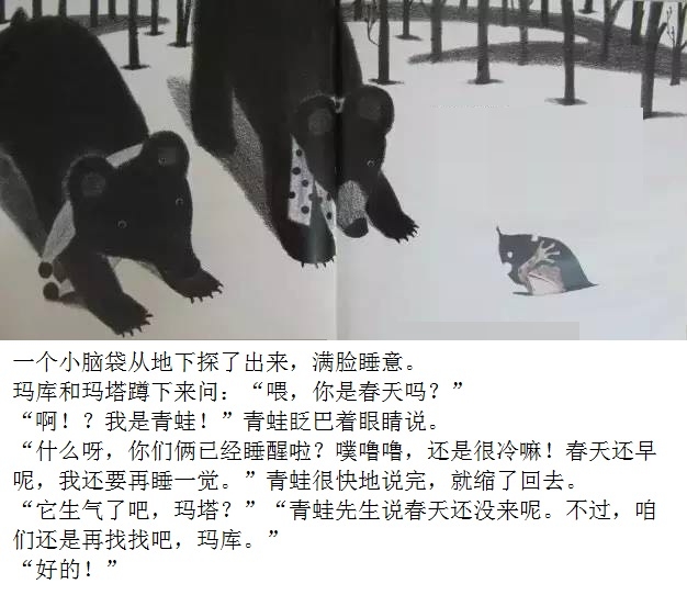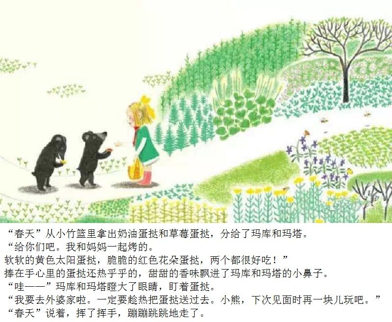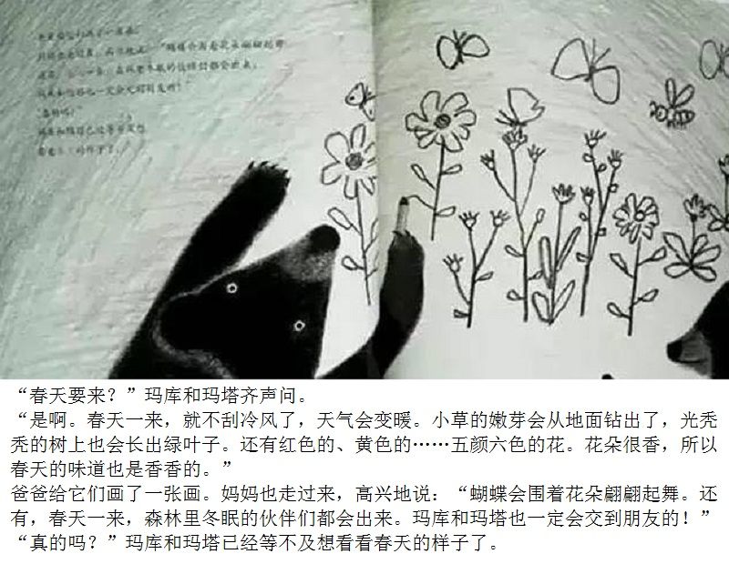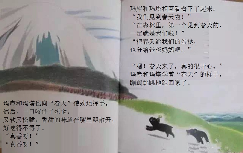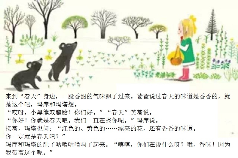 一本适合在春天到来时亲子共读的绘本。 本书画面设计优美,颜色生动。封面上的两只双胞胎小黑熊、黄色蝴蝶、粉色花朵、绿色小草,很快将让小读者感受到了春天的氛围。随着故事情节发展,内文颜色由黑白色,慢慢变为彩色。让小读者随着主人公两只小黑熊一起在书中寻找春天。尤其在文字部分,所有的“春天”二字都使用粉色,与最后一页开满粉色花朵的场景相呼应,“春天”从点滴的预告,逐渐过渡到充满整个世界。 本书内容讲述了双胞胎小熊玛库和玛塔第一次从冬眠中醒来,期盼春天的到来。“春天到底是什么?”听了熊爸爸熊妈妈的话也不明白,于是它们自己出去寻找春天。文字细致描述了小熊找春天时的语言及动作,描绘出了孩子般的天真无邪。对于春天的描写生动活泼,引发小读者期盼春天的共鸣。结尾部分“春天”女孩的登场更是定睛之笔,既在预料之外,又在情理之中。小熊最终把女孩当成了“春天”,高高兴兴返回了家,但小读者们已经体验了真正的春天。在翻看最后一页看到满眼春色时,更是感受到了春天的温暖。