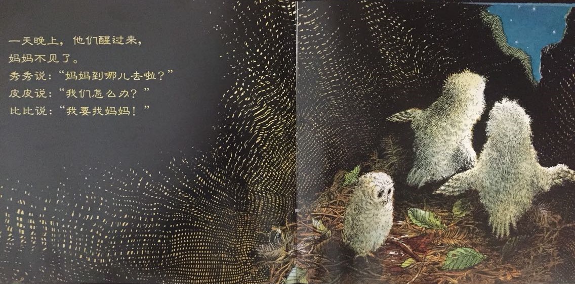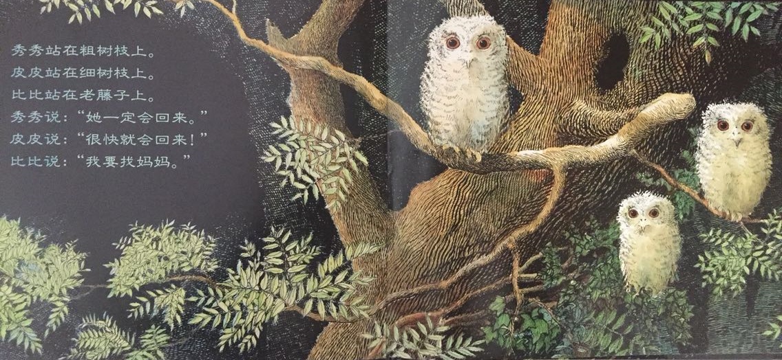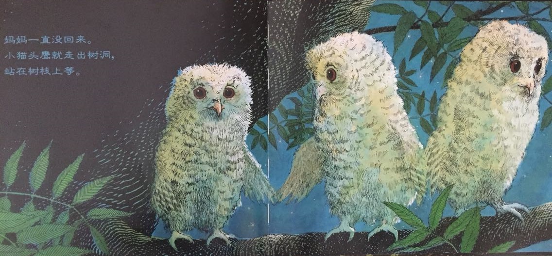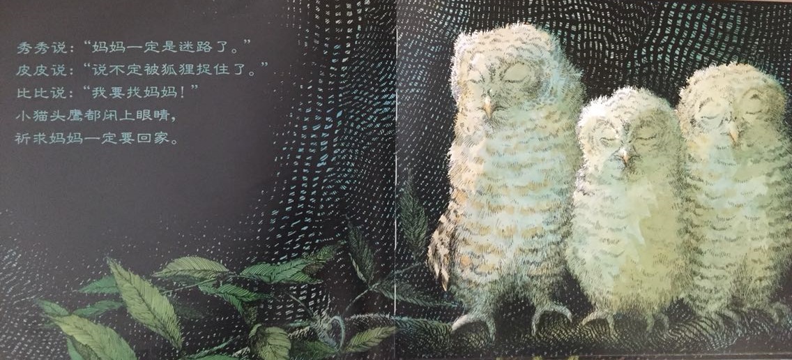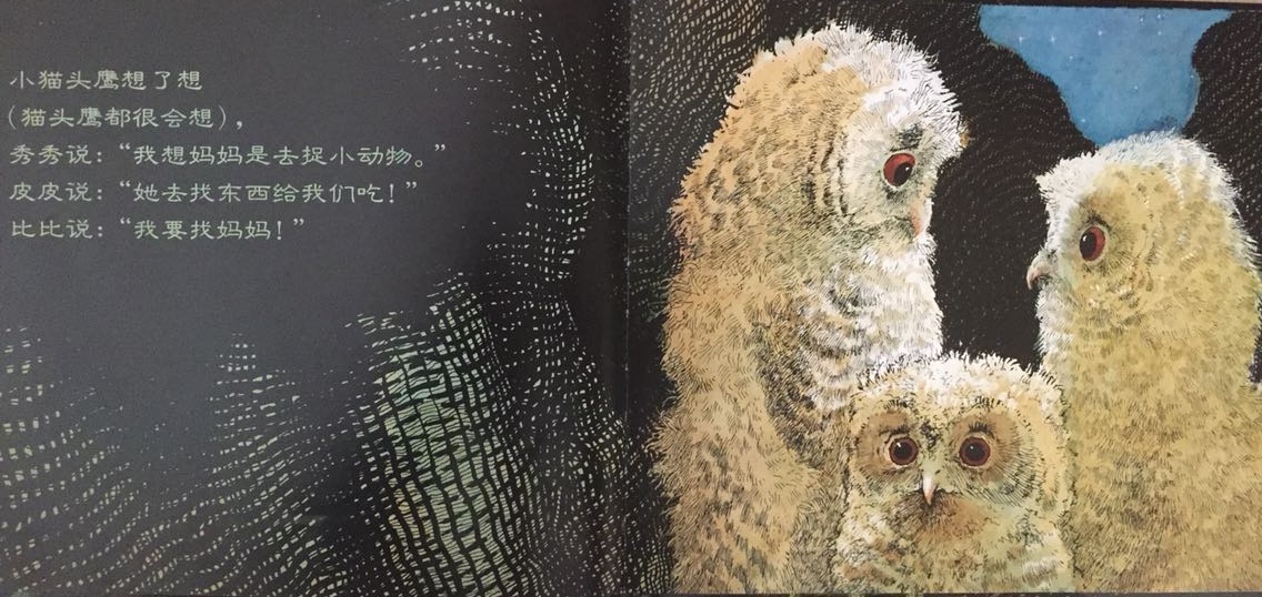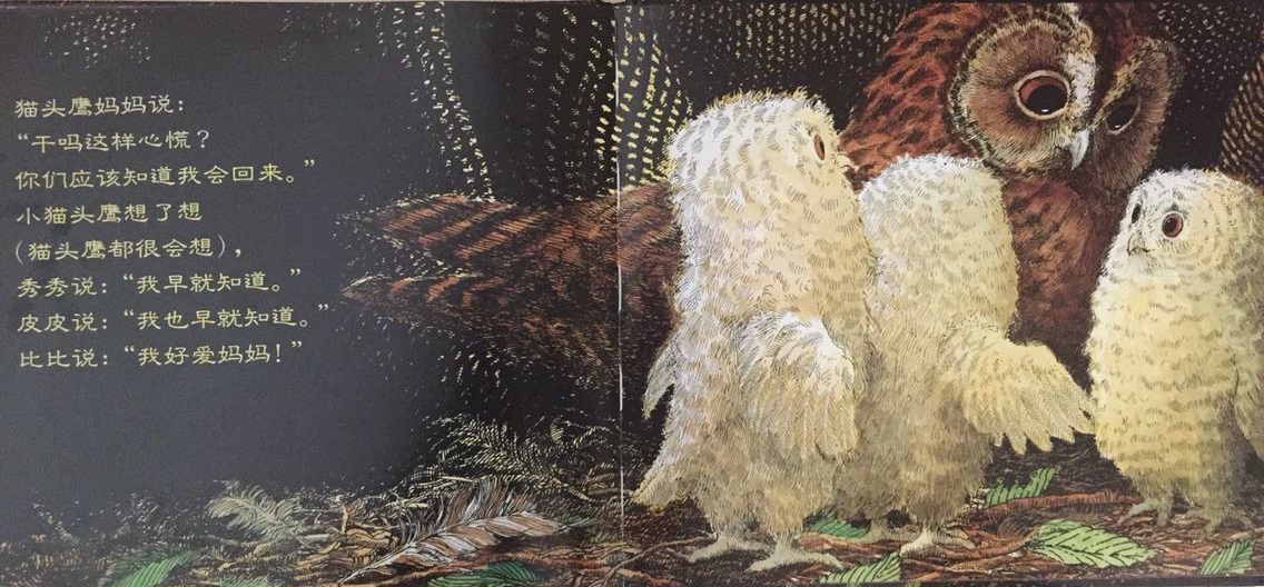 本书叙述了三只小猫头鹰——秀秀、皮皮和比比在黑夜中等妈妈回家的温馨故事。起初,三只小猫头鹰待在温暖的树洞中,因为牵挂,因为担心,也因为思念,他们慢慢走到树洞外面等待。森林是如此的黑,让秀秀、皮皮和比比互相依偎在一起,并且闭上双眼,祈求妈妈快快回家。最后…… 作者将猫头鹰拟人化,并且利用浅白易懂的文句,透露出孩子在等待妈妈回家时的彷徨与忧心。文中数度提到了“猫头鹰都很会想”,其实是在暗指人类社会中,孩子也是有想法的,尤其独自在家时,是多么期待父母亲的归来呀!看似简短、反复的童言童语,表达的意义却如此深刻隽永,是一部真情自然流露的温情作品!