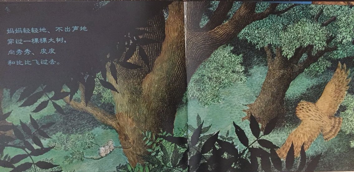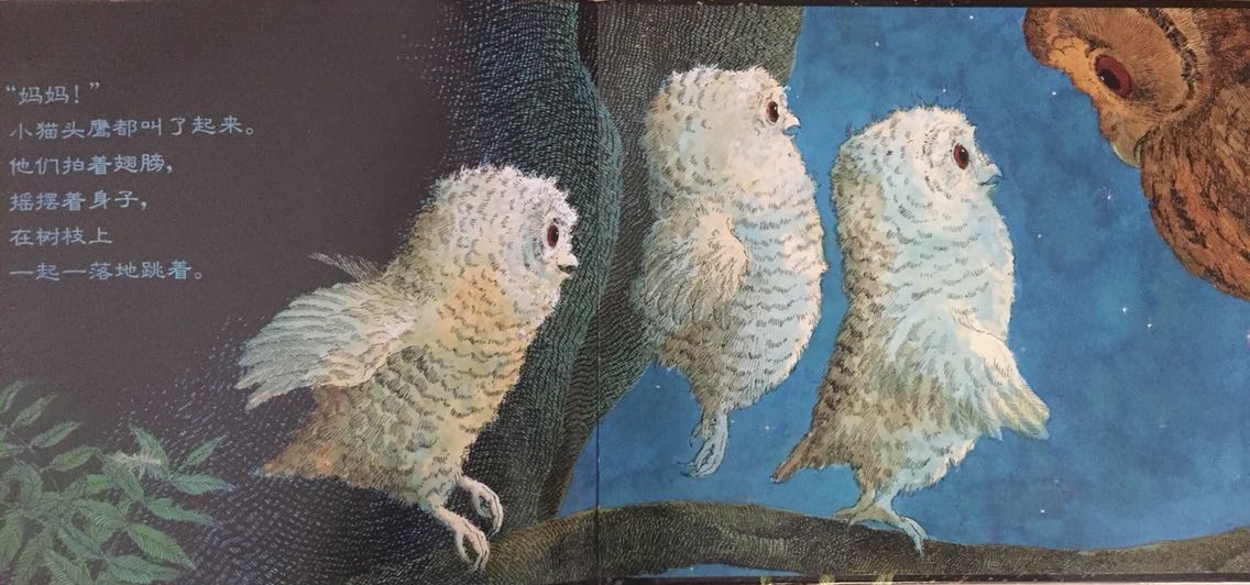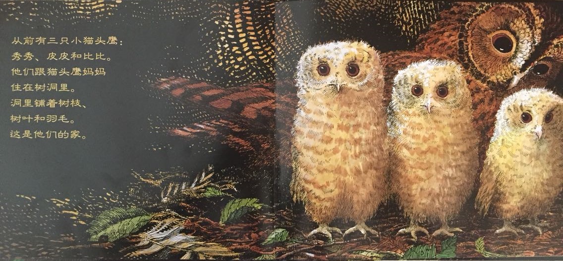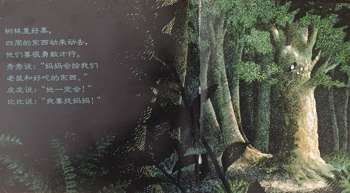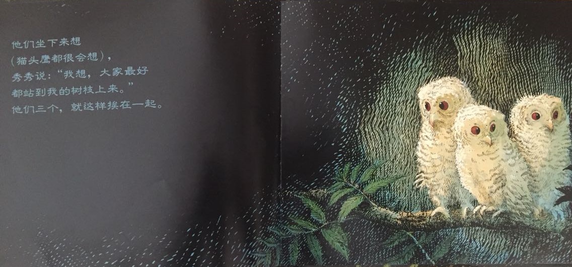 本书叙述了三只小猫头鹰——秀秀、皮皮和比比在黑夜中等妈妈回家的温馨故事。起初,三只小猫头鹰待在温暖的树洞中,因为牵挂,因为担心,也因为思念,他们慢慢走到树洞外面等待。森林是如此的黑,让秀秀、皮皮和比比互相依偎在一起,并且闭上双眼,祈求妈妈快快回家。最后…… 作者将猫头鹰拟人化,并且利用浅白易懂的文句,透露出孩子在等待妈妈回家时的彷徨与忧心。文中数度提到了“猫头鹰都很会想”,其实是在暗指人类社会中,孩子也是有想法的,尤其独自在家时,是多么期待父母亲的归来呀!看似简短、反复的童言童语,表达的意义却如此深刻隽永,是一部真情自然流露的温情作品!