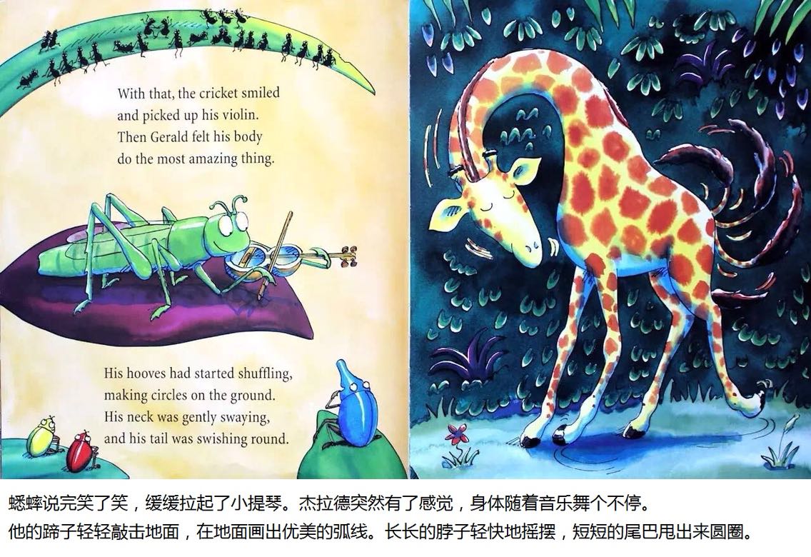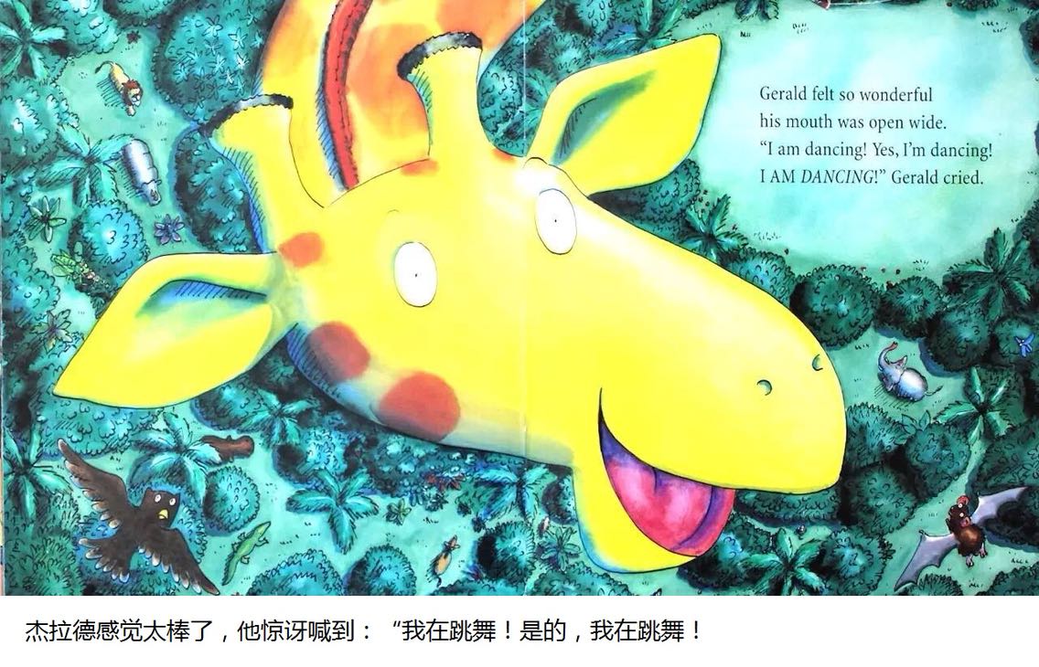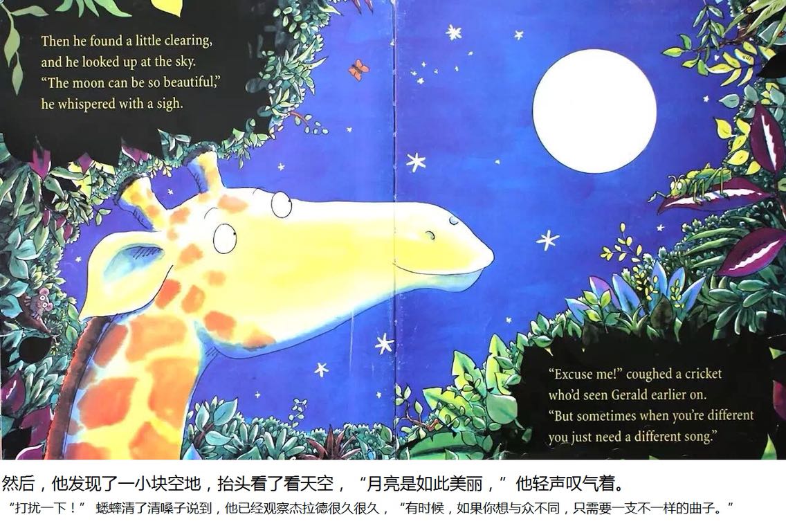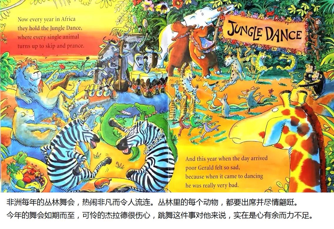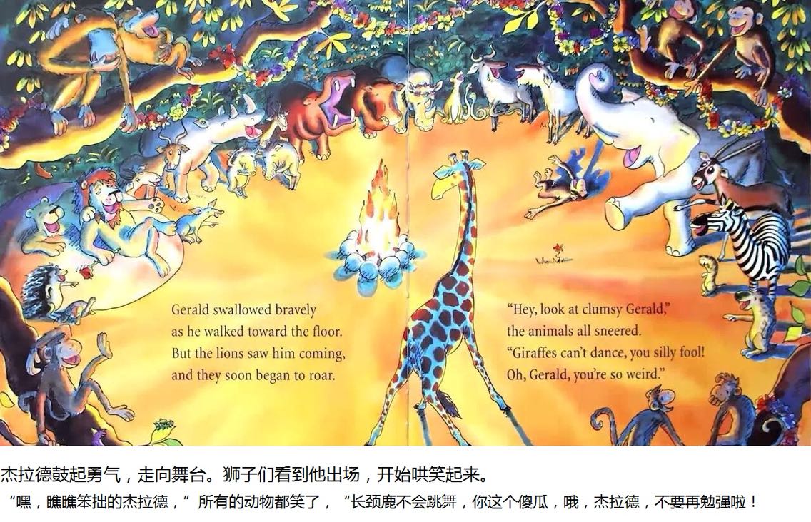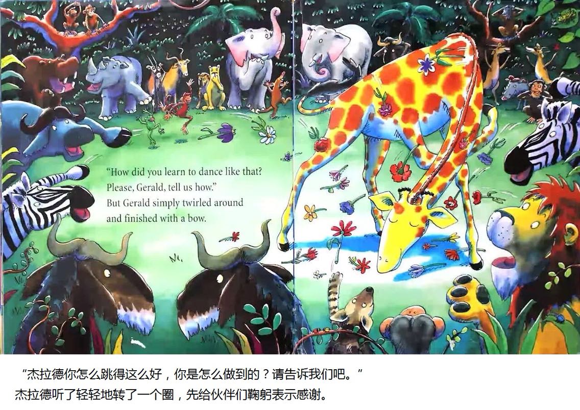 杰拉德是只长颈鹿,长脖子优美而纤细。可惜膝盖向外弯曲,腿瘦得骨头连着皮。 杰拉德不太会跳舞。每年他都担心灰在丛林舞会出丑。但是在一个美丽的月圆之夜,杰拉德发现,原来换一首音乐来跳舞,就可以变得独一无二……