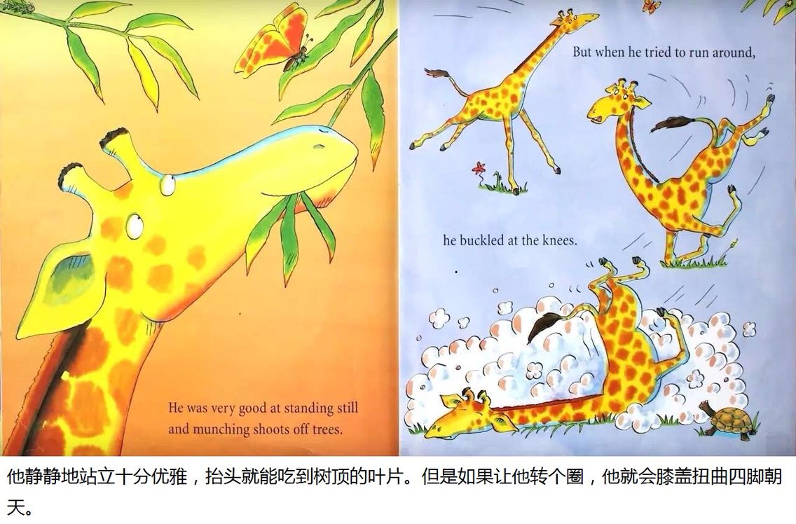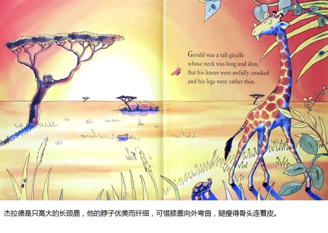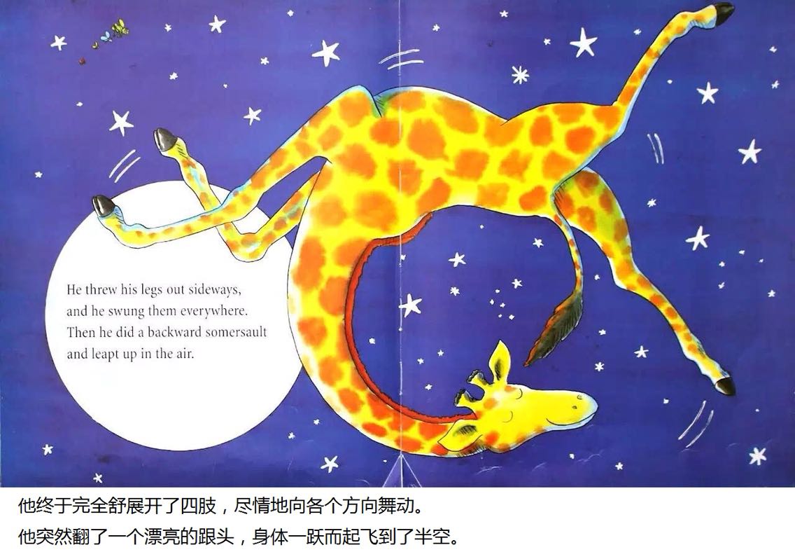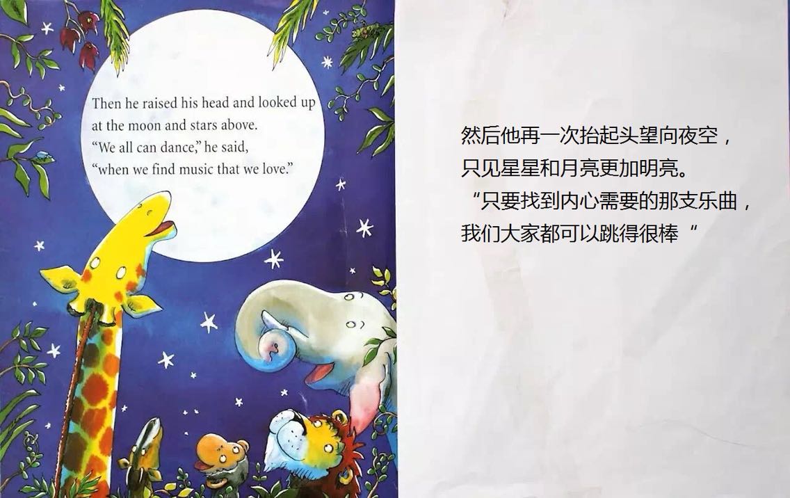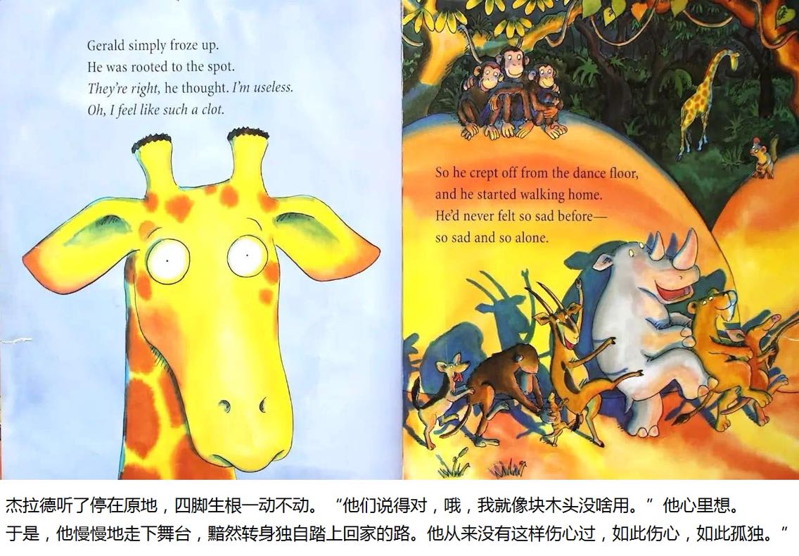 杰拉德是只长颈鹿,长脖子优美而纤细。可惜膝盖向外弯曲,腿瘦得骨头连着皮。 杰拉德不太会跳舞。每年他都担心灰在丛林舞会出丑。但是在一个美丽的月圆之夜,杰拉德发现,原来换一首音乐来跳舞,就可以变得独一无二……