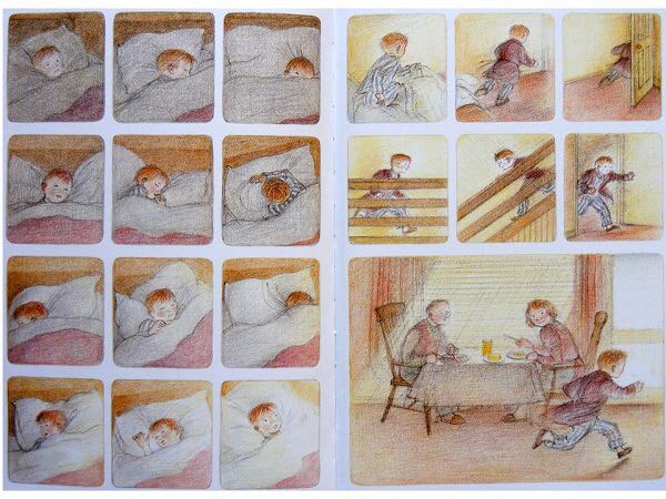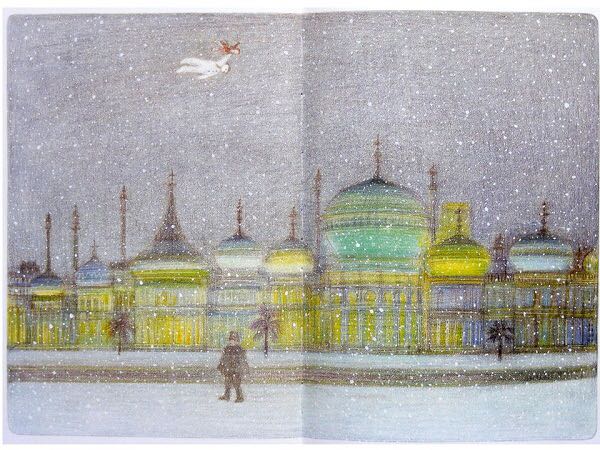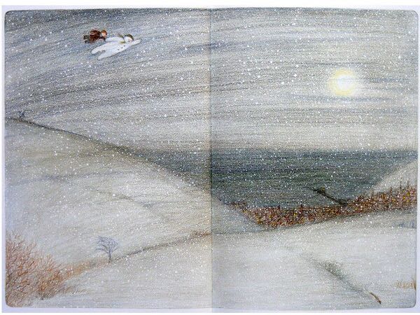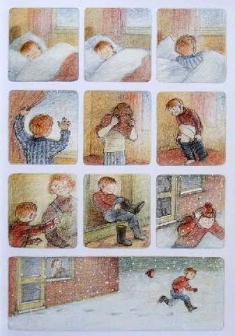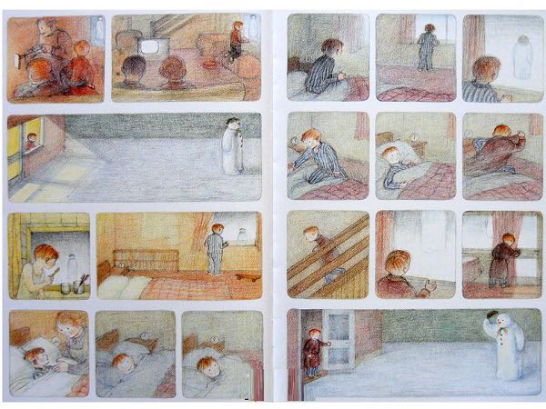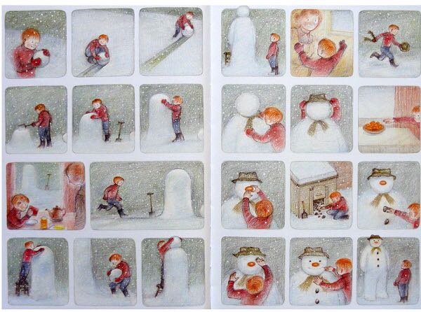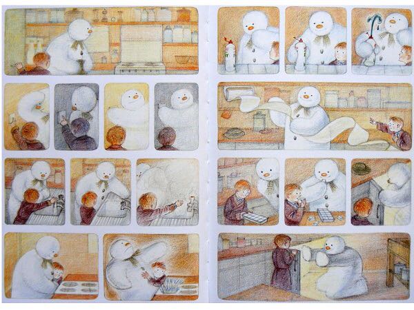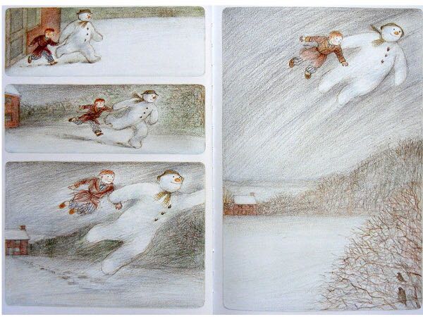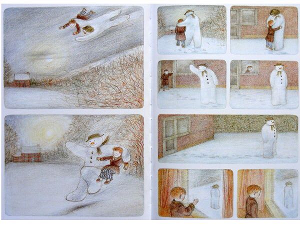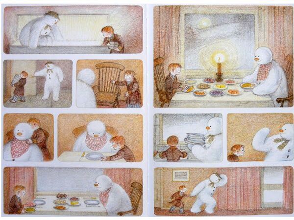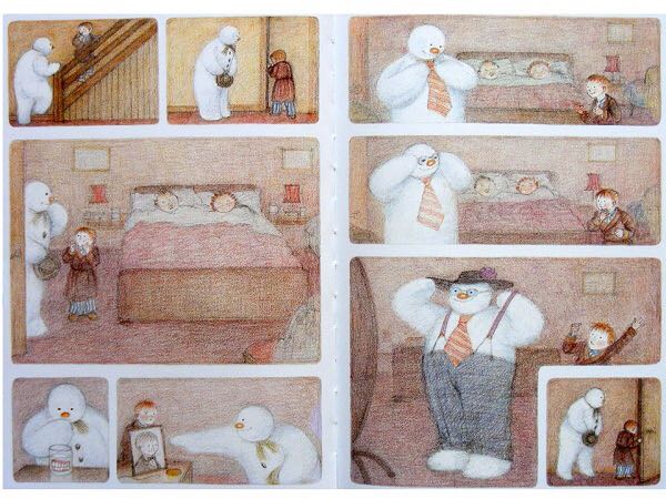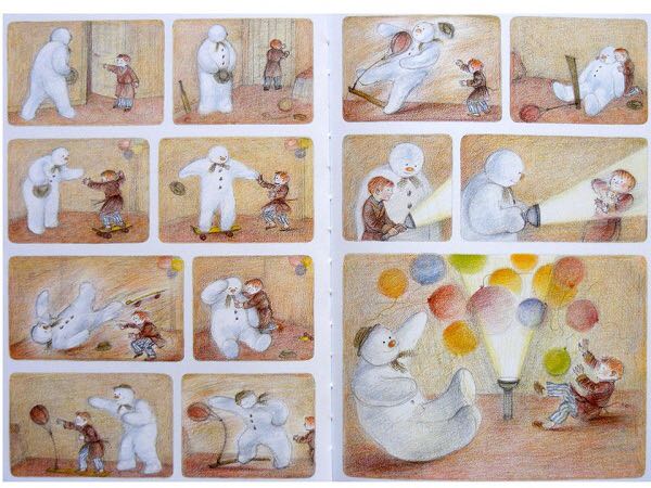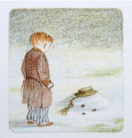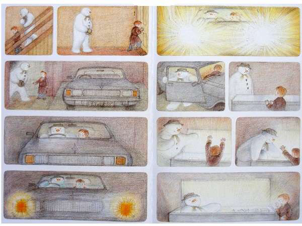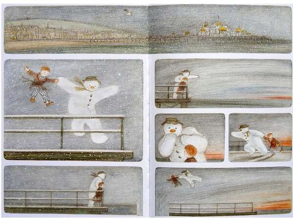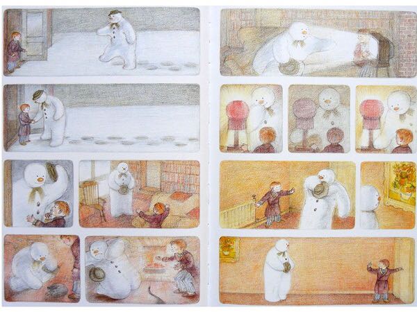 《雪人》内容简介:少年早上起来,发现窗外已经是雪花飘飘了。他冲出屋去,堆了一个足足比他高出一倍的雪人。他给它戴上了帽子,系上围巾,又用橘子给它装上了一个大红鼻头,用煤球做了眼睛,再画上嘴。哈,一个活灵活现的大雪人! 可这天夜里,少年翻来覆去怎么也睡不着。半夜12点,他爬了起来,打开了前门,哇!他发现雪人活了,雪人正摘下帽子向他致礼哪。 少年请雪人来家里坐客,这让这个冰冷的巨人非常兴奋,它看了猫、看了电视、试着开了开灯、把厨房的纸巾全都扯了出来,它喜欢大嚼冰块,但它怕火。少年“嘘”了一声,轻手轻脚地把它领上楼,带进爸爸妈妈的卧室,让它看熟睡的爸爸妈妈。它盯着爸爸浸在杯子里的假牙看了半天,还戴上妈妈那顶缀着一朵紫花的宽檐帽,系上爸爸的领带,戴上爸爸的眼镜,穿上爸爸那条系不上扣子的裤子,照起了镜子。然后,少年和雪人在楼下共进了一顿丰盛的烛光晚餐。 接下来,该轮到雪人了。 它拉着少年出了门,手牵手地一起飞到了风雪交加的天空上。飞过荒野,飞过了一个看上去像是俄罗斯或是中东的地方,降落到了看得到海的栈桥上。可看着看着,雪人突然发现不对了,天边出现了一抹红霞,不好,太阳要出来了! 它拉着少年飞了回去