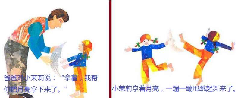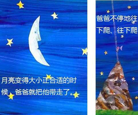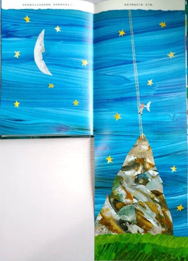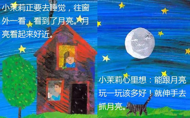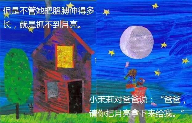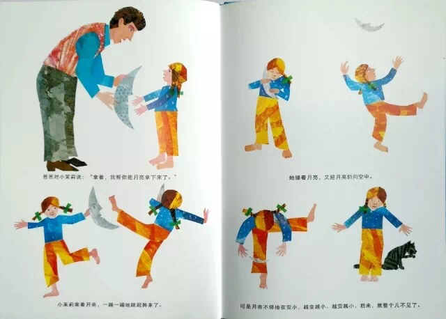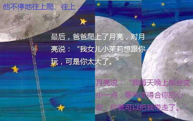 小茉莉很想和月亮一起玩,但她摘不到月亮,便拜托爸爸把月亮摘下来,于是爸爸拿了一把好长好长的梯子,架在一座好高好高的山上,努力地向上爬呀爬,但是月亮太大拿不下来,爸爸只好等到月亮变成下弦月,才把月亮带回给小茉莉玩…… 这是有关爱与梦想的故事,上下打开的多种折页变化,让孩子惊奇感受空间延伸的巧妙创意。孩子从故事情节中,不仅可以了解长短、高矮、大小等概念与形容词,还能从中观察到月亮阴晴圆缺的自然现象。