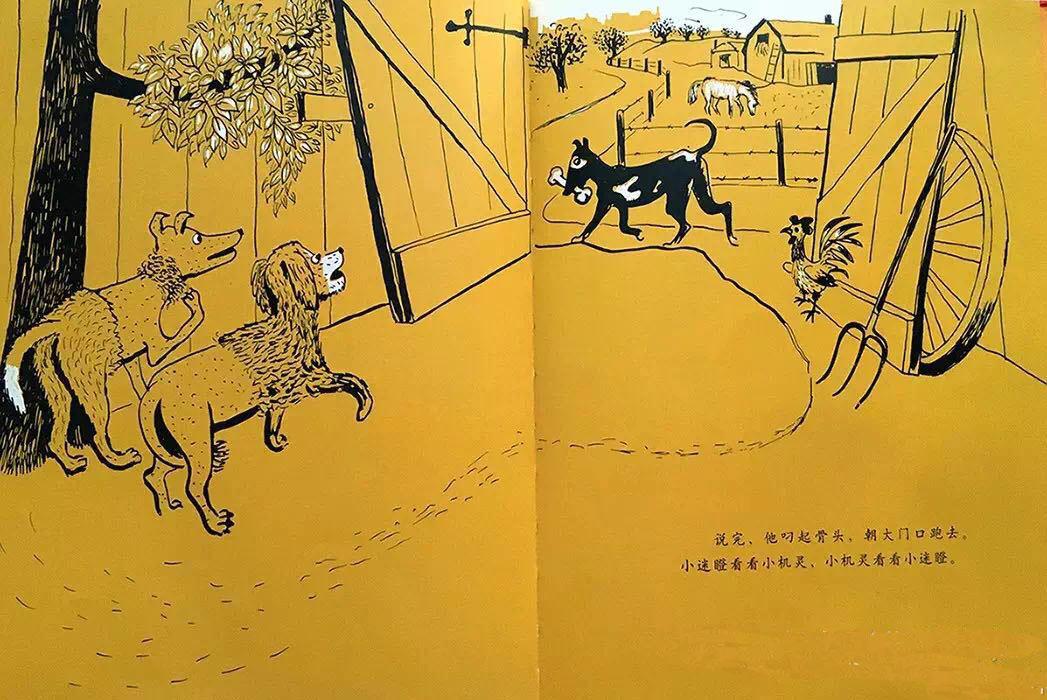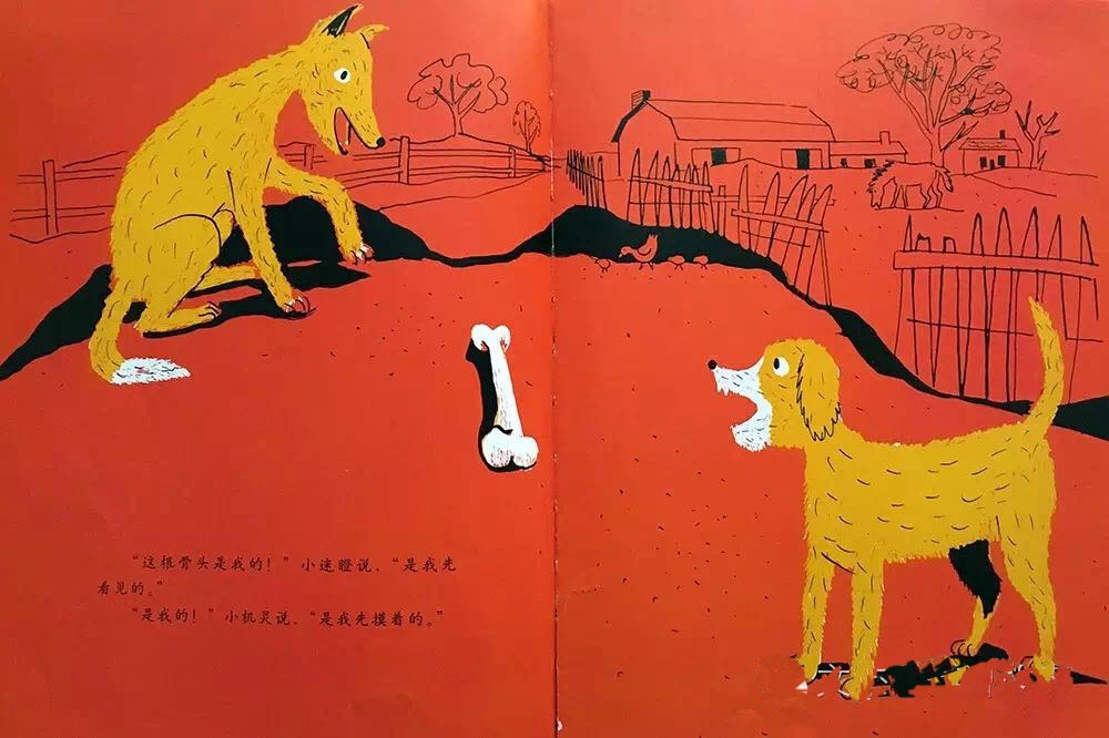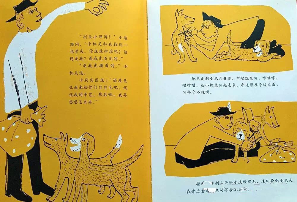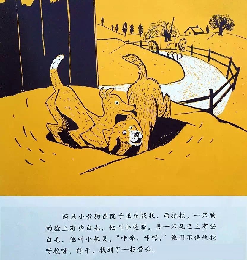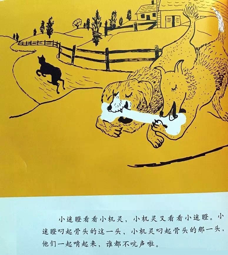 两只小黄狗小机灵和小迷瞪在院子里找东西吃,不停地挖啊挖,终于找到了一根骨头。可是骨头到底该归谁呢?他们问了农夫,农夫只关心马车;问了山羊,山羊只想着吃草;问了小剃头匠,他只为了试试手艺……一路上,他们帮了别人做了很多事,可骨头的事依旧没有解决。直到一只大狗的到来,抢了骨头,他们决定打退敌人,共同拥有这根骨头。问题终于迎刃而解了,原来分享就是最好的方法。一本向读者展现最童真画面,体会分享的可贵与快乐的绘本。