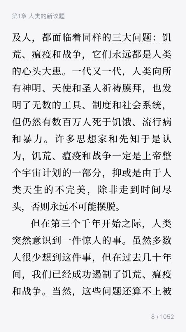 进入21世纪后,曾经长期威胁人类生存、发展的瘟疫、饥荒和战争已经被攻克,智人面临着新的待办议题:永生不老、幸福快乐和成为具有“神性”的人类。在解决这些新问题的过程中,科学技术的发展将颠覆我们很多当下认为无需佐证的“常识”,比如人文主义所推崇的自由意志将面临严峻挑战,机器将会代替人类做出更明智的选择。 更重要的,当以大数据、人工智能为代表的科学技术发展的日益成熟,人类将面临着从进化到智人以来zui大的一次改变,绝大部分人将沦为“无价值的群体”,只有少部分人能进化成特质发生改变的 “神人”。 未来,人类将面临着三大问题:生物本身就是算法,生命是不断处理数据的过程;意识与智能的分离;拥有大数据积累的外部环境将比我们自己更了解自己。如何看待这三大问题,以及如何采取应对措施,将直接影响着人类未来的发展。