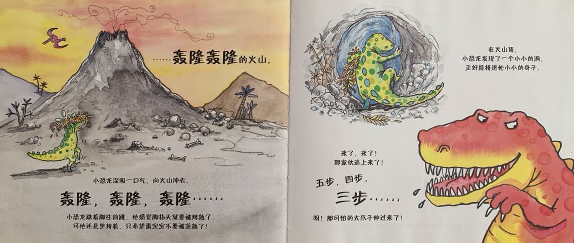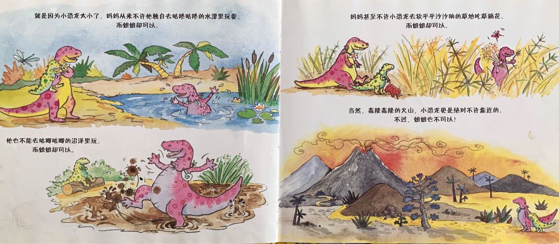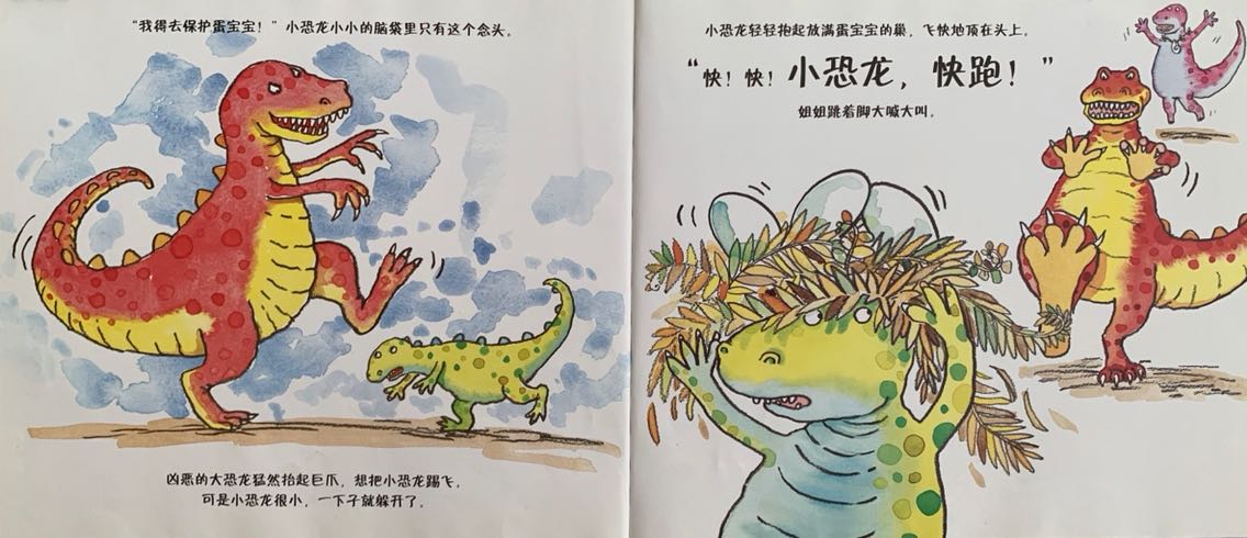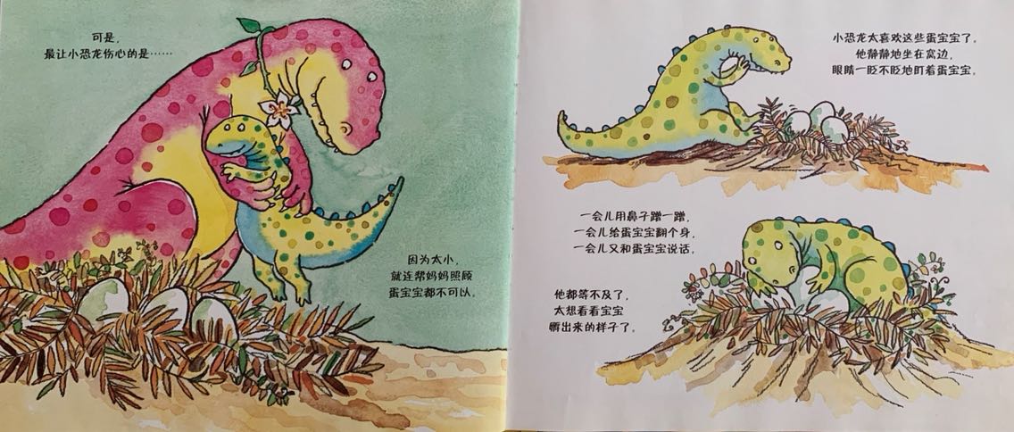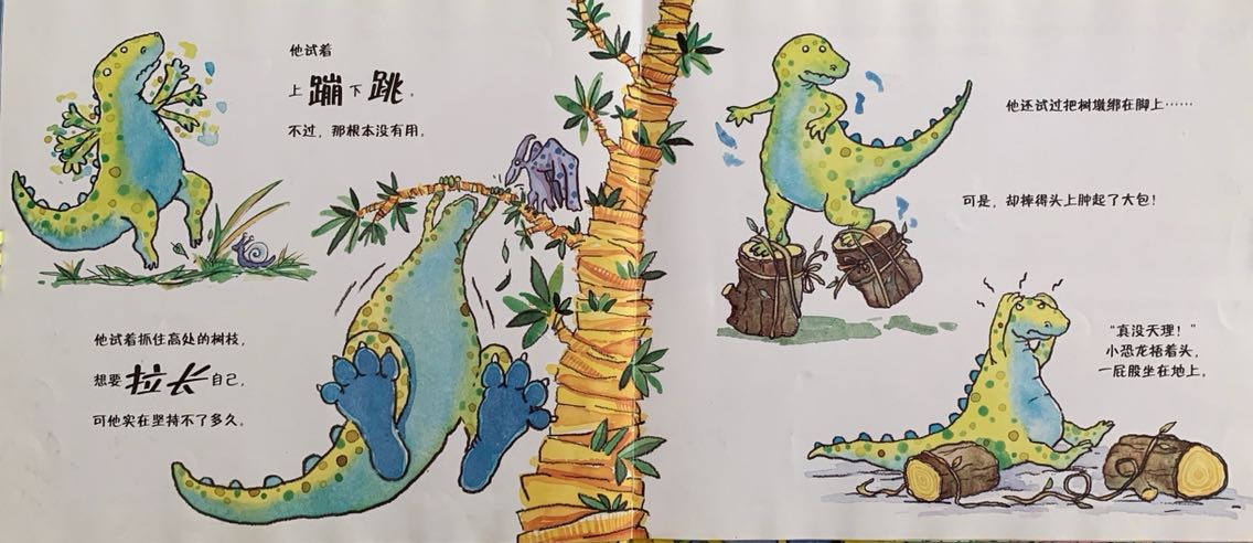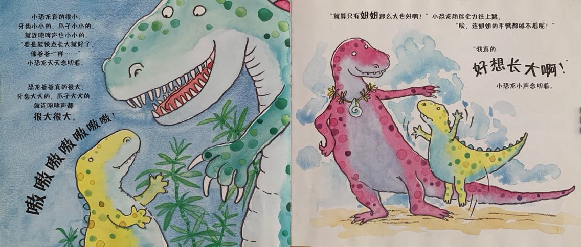 《我想快点长大》中的小恐龙真是好“可怜”,因为太小,他不能去水潭玩,不能去沼泽玩,不能去草地玩,不能去火山附近玩……而这些姐姐都能做,小恐龙真的好伤心,因为连帮妈妈照顾蛋宝宝都不可以。小恐龙多么渴望快点长大,他上蹦下跳,他吊在树干上,他踩着木头墩,但是种种尝试都没能实现他变大的愿望。直到有一天,家里来了位不速之客,并且发生了一件极可怕的事情,危急时刻,姐姐做不到的事情,小恐龙竟然做到了,他是怎么做到的呢,原因很简单,因为小恐龙小。小恐龙这才发现,其实有时小小的也挺好的。