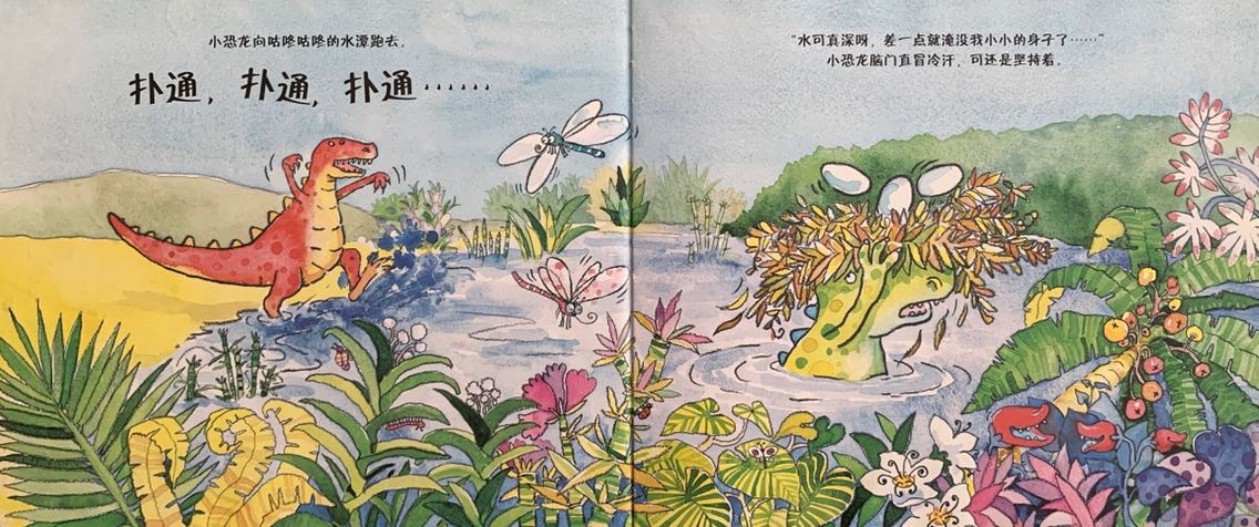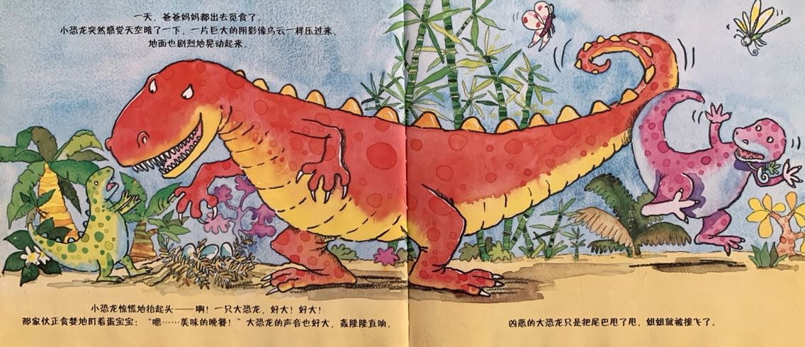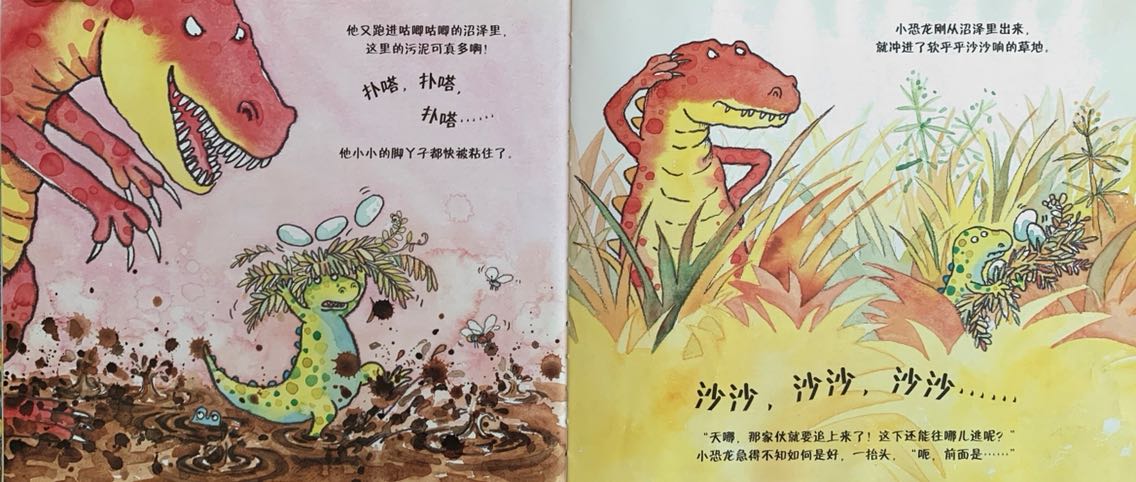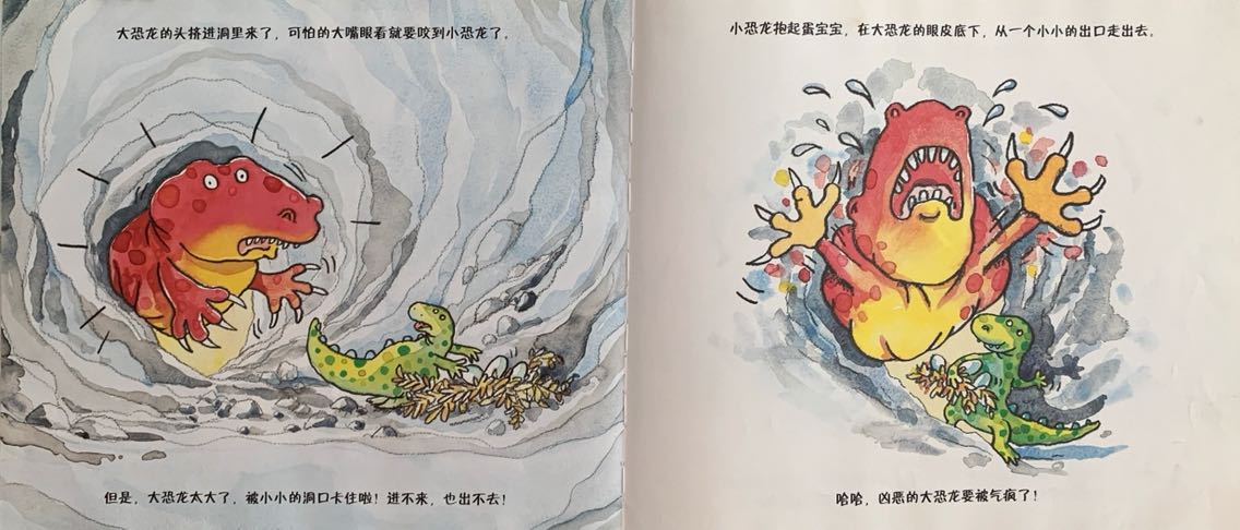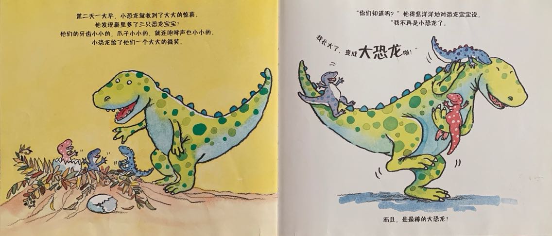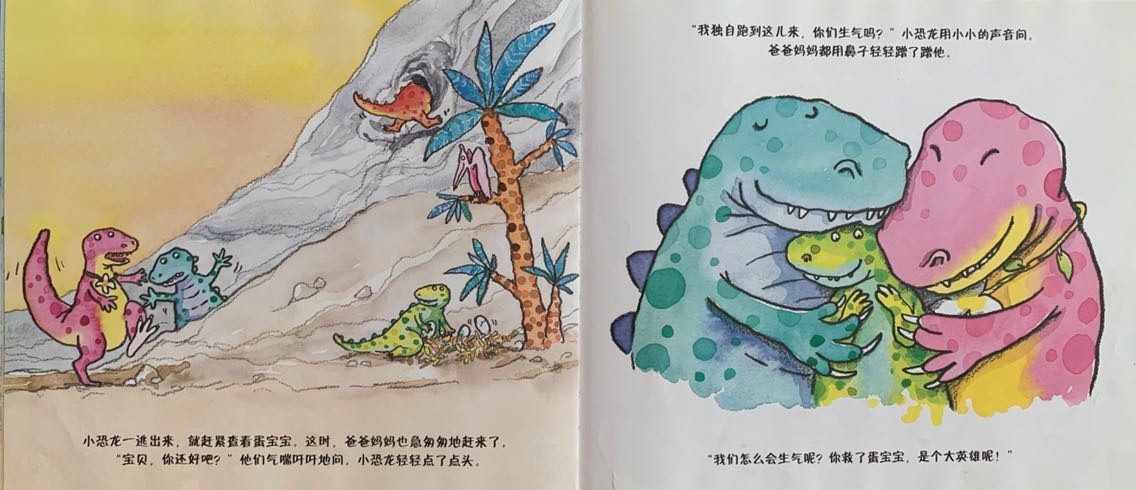 《我想快点长大》中的小恐龙真是好“可怜”,因为太小,他不能去水潭玩,不能去沼泽玩,不能去草地玩,不能去火山附近玩……而这些姐姐都能做,小恐龙真的好伤心,因为连帮妈妈照顾蛋宝宝都不可以。小恐龙多么渴望快点长大,他上蹦下跳,他吊在树干上,他踩着木头墩,但是种种尝试都没能实现他变大的愿望。直到有一天,家里来了位不速之客,并且发生了一件极可怕的事情,危急时刻,姐姐做不到的事情,小恐龙竟然做到了,他是怎么做到的呢,原因很简单,因为小恐龙小。小恐龙这才发现,其实有时小小的也挺好的。