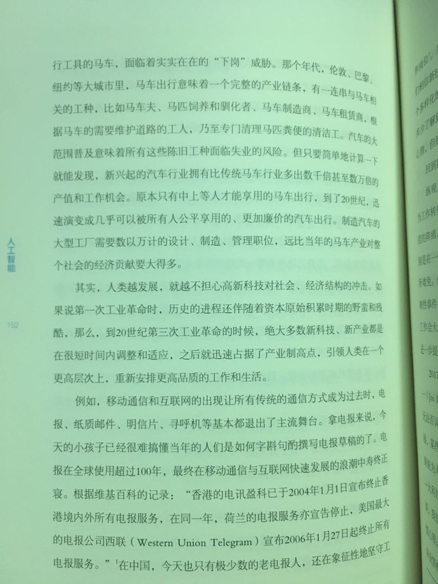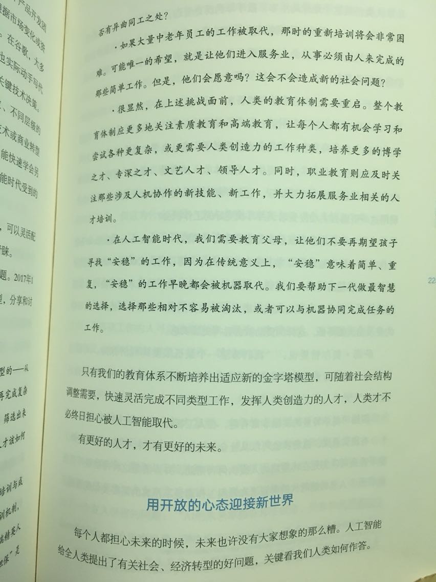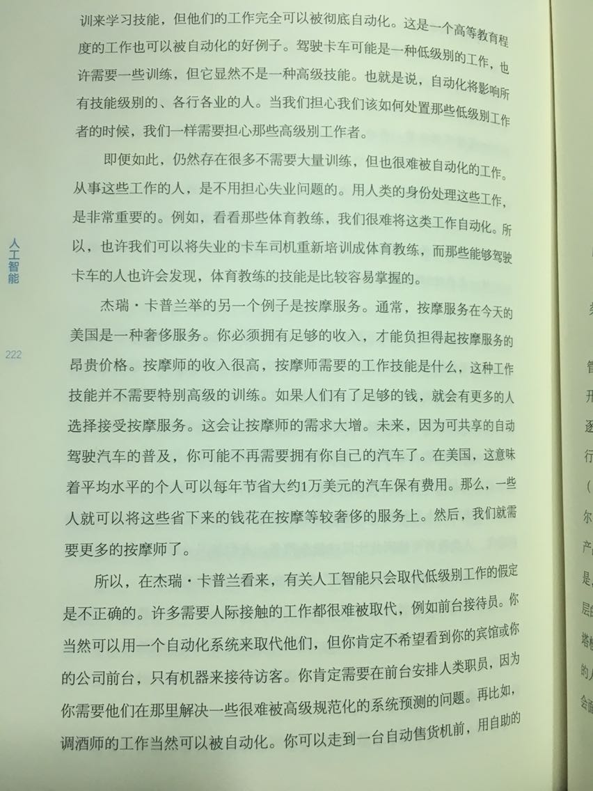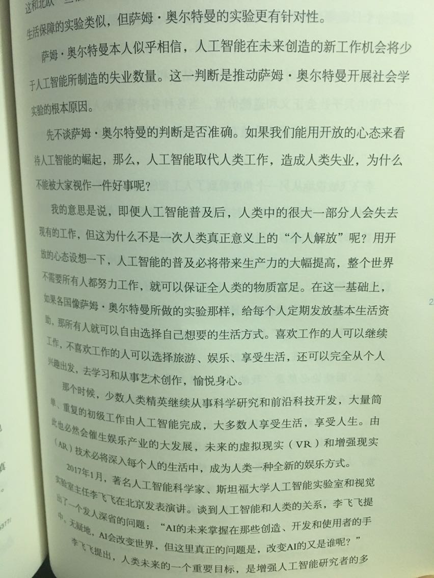 非常喜欢李开复老师的乐观心态。生产力急剧提高,人类中的大多数无需做以往谋生的工作即可生存,这样就能做更多的创造性的活动。想想几千年来,从极少数人(贵族、雅士等)从事创造或娱乐,到现在越来越多的人能够全职或兼职地从事创造或娱乐,这不是进...