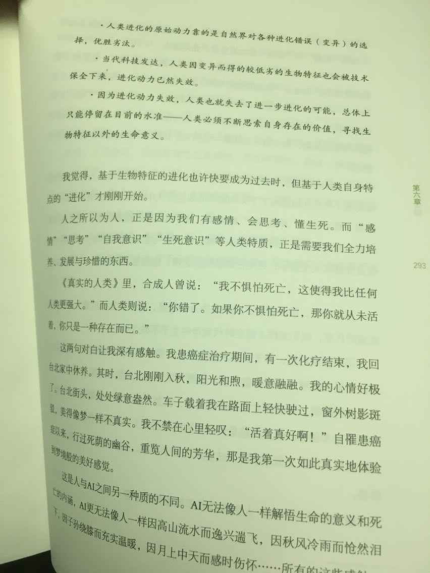 这些是人类高于人工智能的地方。书中又提到了英国科幻电视剧《真实的人类》,我很喜欢的电视剧。“如果你不惧怕死亡,那你就从未活着,你只是一种存在而已”,说出这样的话,编剧莫非是哲学大师?!